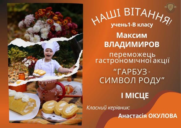 У межах осінньої кулінарної акції «Гарбуз - символ роду» учень 1-В класу Максим Владимиров, творчо та з любов’ю разом із родиною підійшов до участі в конкурсі - і результат не забарився. І місце стало приємним і заслуженим підсумком цієї роботи. Ця перемога - результат спільної праці, підтримки та натхнення, які першокласники отримують щодня поруч зі своєю класною керівницею Анастасією Окуловою.